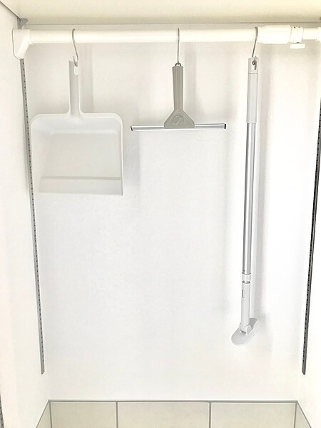 掃除道具は、一概に外で使うものだけでなく”長く収納しづらいものは吊るして”。