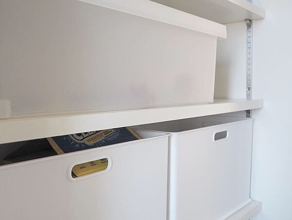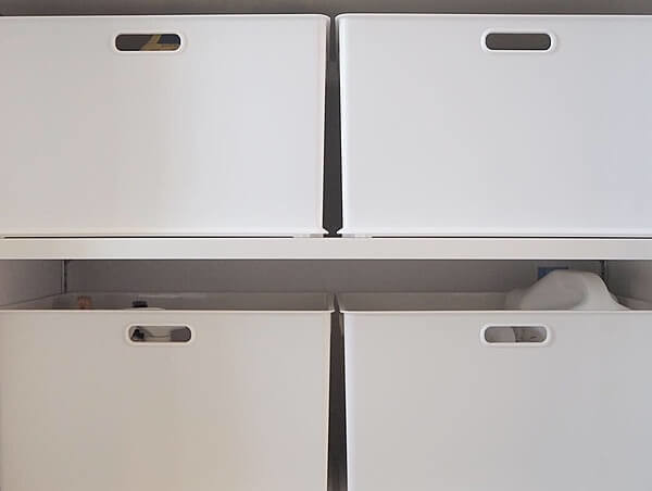 我が家では使用頻度の少ない靴は高い位置へ。そして高い位置でも取り出しやすく見た目の良いイケアのSKUBB(スクッブ)に収納しています。