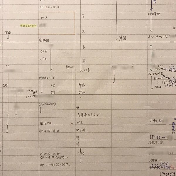 我が家は5人なので、一番上にそれぞれの名前を記入し縦一列ごとに各自の予定を記入しています。