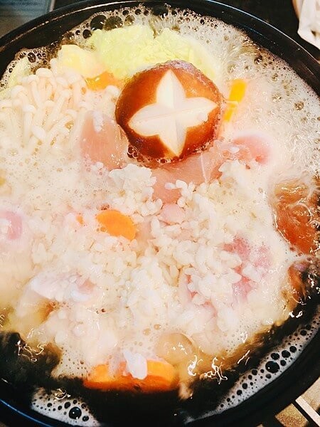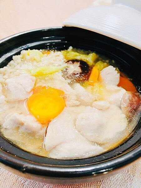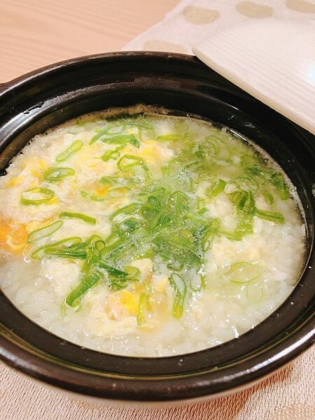① 残ったスープにごはんを入れ、グツグツしてごはんが柔らかくなったら溶き卵を回し入れてその上に葱をのせて蓋をしめ火を止めます。