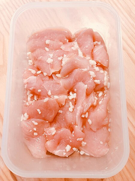 ① 鶏肉は一口大に切って下味用の塩麹に漬けておきます。