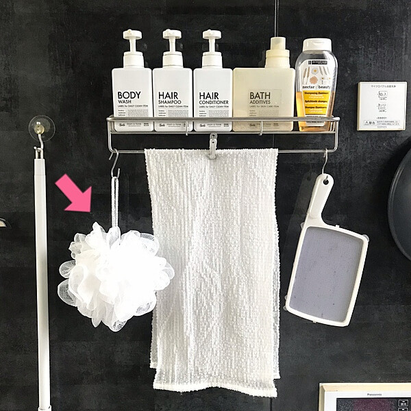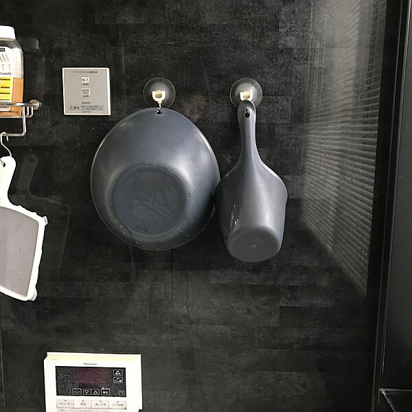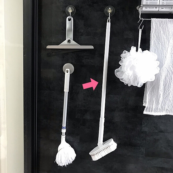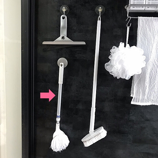 お風呂の掃除用品は水切れを良くしたいのと、掃除がしやすいように、壁に吸盤をつけて引っ掛け見せっぱなし収納。