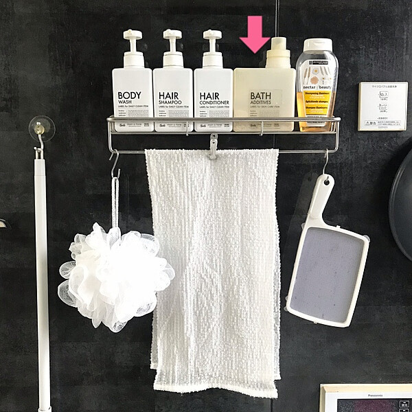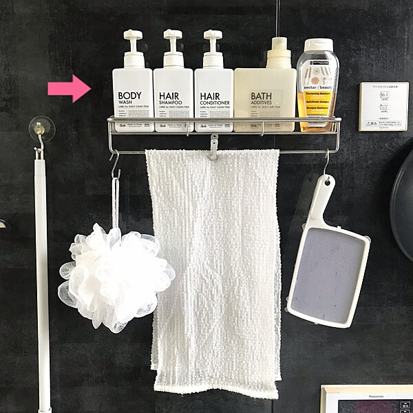 目立たせたくない洗面器や手おけは、壁と似たグレーに、ボトルはラベルシールを貼りたかったので、白で統一しました。