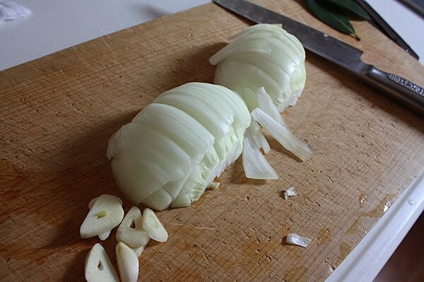 肉を焼いた鍋に油を足して、玉ねぎとにんにくを炒めます。
