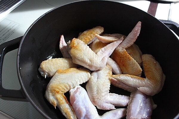 煮込む大きさの鍋に油を引いて、手羽先を皮目から焼いていきます。