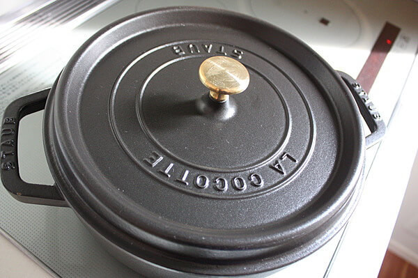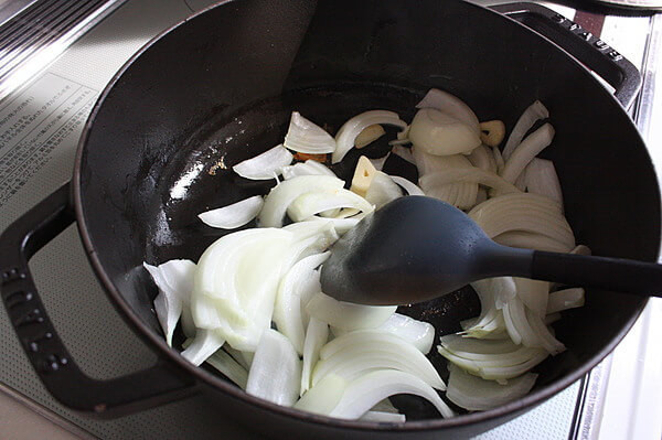 使ってる鍋が厚手で、気密性が高い無水調理ができる鍋の場合(ストウブなど)は、白ワインと野菜と肉の水分で蒸し煮してください。
