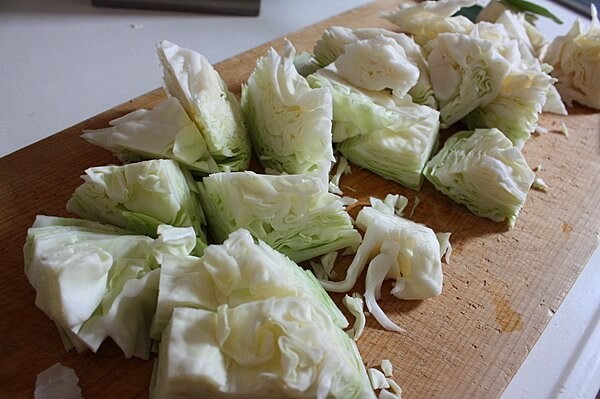 玉ねぎとにんにくを炒めてる間に、キャベツをザクザクっと、ひと口大に切っておきましょう。