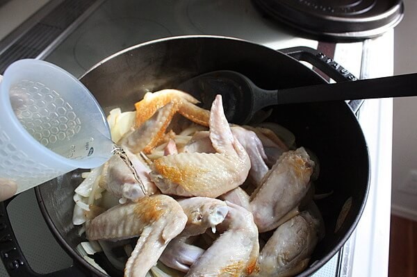 玉ねぎがしんなりしてきたら、手羽先を鍋に戻してください。