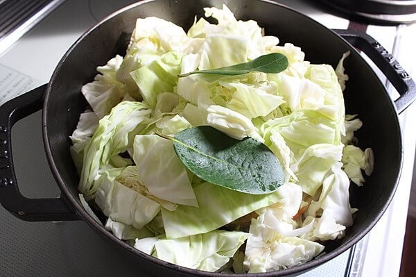 ザクザクキャベツとベイリーフと塩を少しまぶして……。