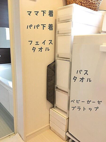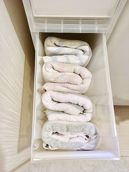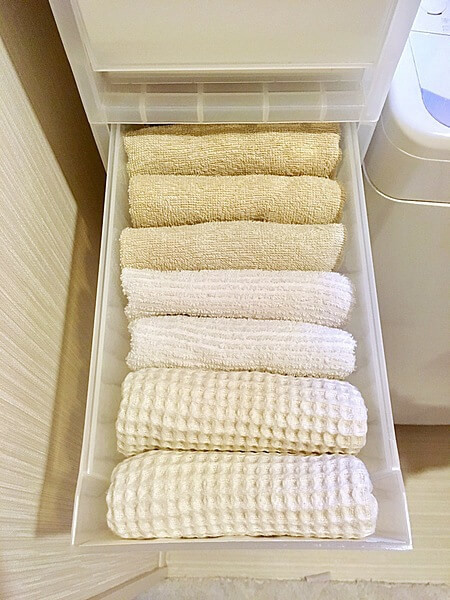 備え付けの収納はないので、隙間を利用してタオルを収納することに。