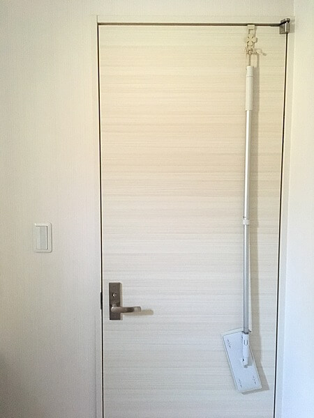 入り口の扉に、フローリングモップを掛けて収納しています。