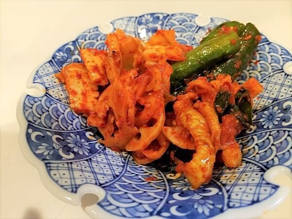 スタンダードな白菜に加え、きゅうり(いわゆるオイキムチですね)、いか、れんこんの4種の味が一度に楽しめます。