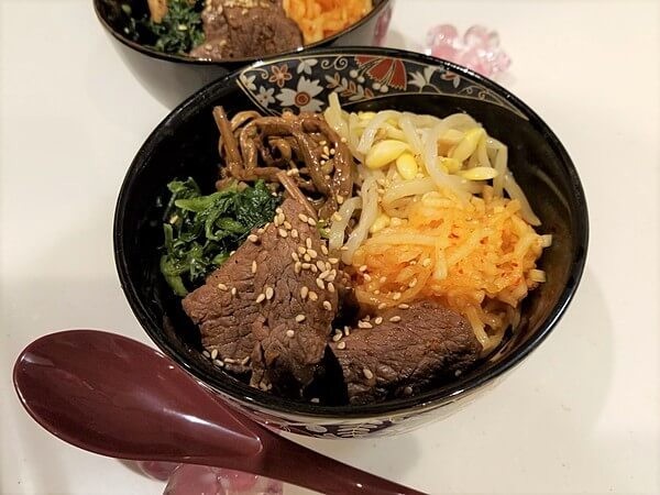 このナムルに味付けした牛カルビ肉をプラスしてビビンバ丼にすれば、立派な野菜たっぷりの一品ができあがります。我が家では焼き肉のたれとコチュジャンで肉の味つけをすることが多いですね。