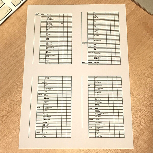 私が使用している実際の買い物リストです。 エクセルで作っていて、必要に応じて編集しています。