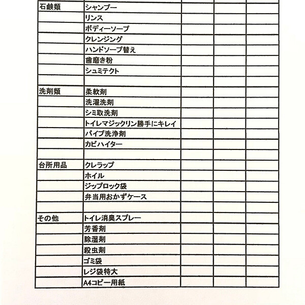 我が家では日用消耗品は月に一度まとめて買うのです。そのためのお買い物リストもバッチリ作ってます。