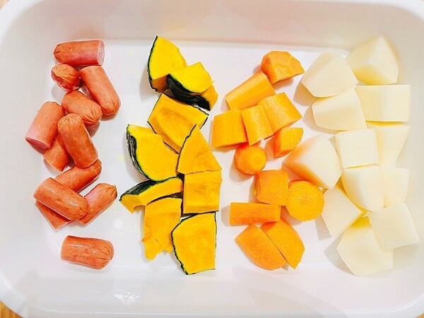 ① 野菜とウインナーは食べやすい大きさに切っておきます。