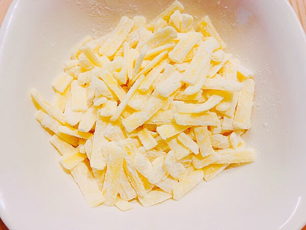 チーズに片栗粉をしっかりまぶすことでチーズが分離しにくくなります。