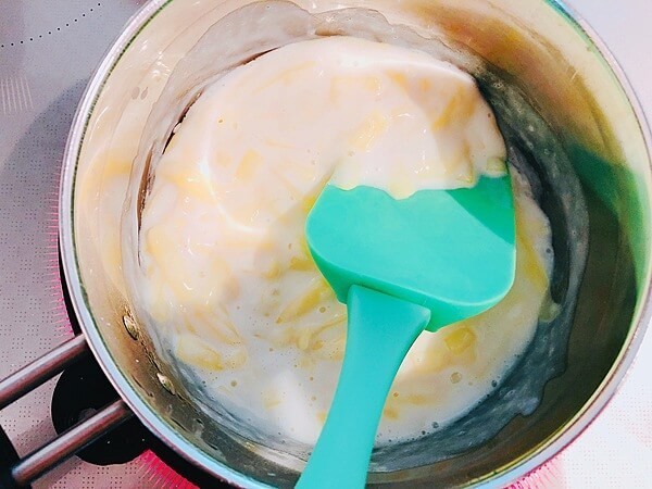 ⑤ 別の鍋に牛乳を入れて加熱し、まわりがフツフツしてきたら④を加えてよく混ぜます。