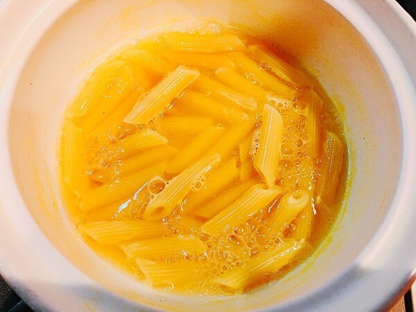 ① お鍋のスープにペンネを入れて規定時間茹でます。