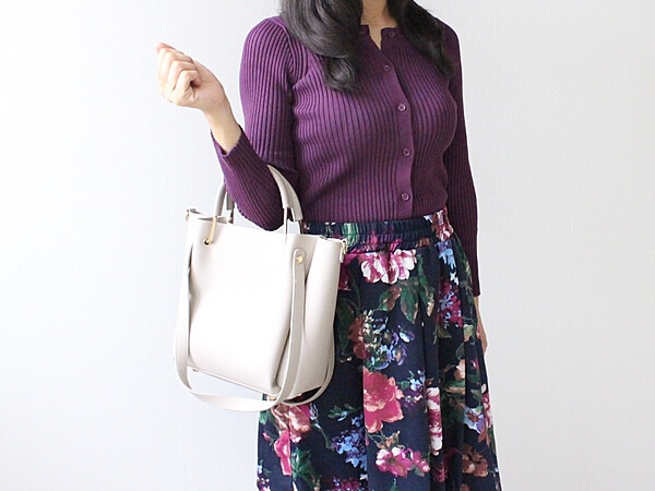 すっきりとしたデザインなので、大きめサイズでも野暮ったく見えず、女性らしいシルエットが完成。