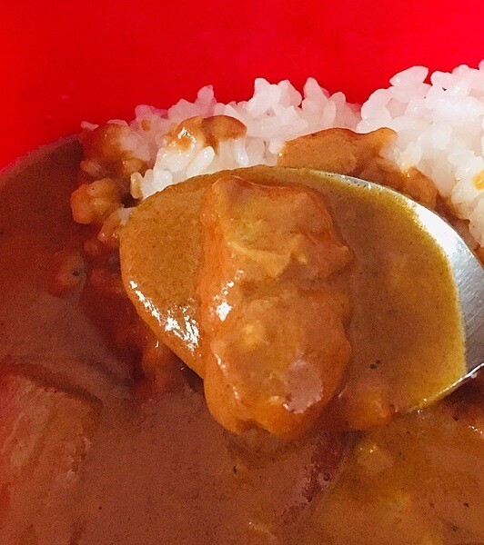 写真でもわかるように普通のレトルトカレーに近い感じですね。お肉のゴロゴロ感もいいですが、子どもにもおすすめできるくらい優しい辛さに仕上がっているので、老若男女問わず楽しめると思います。