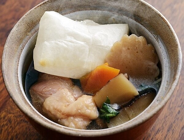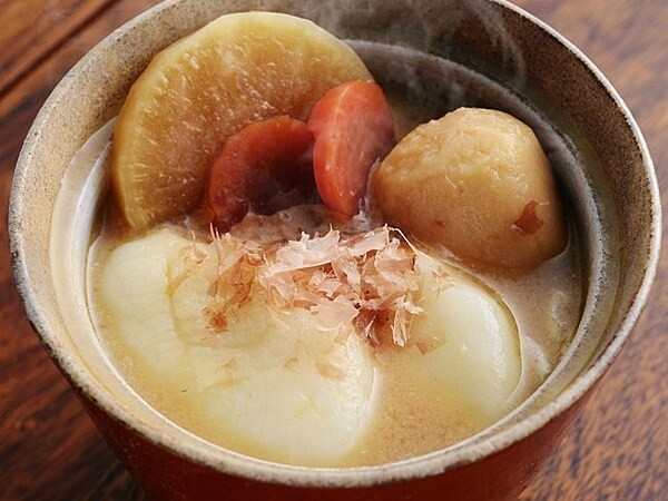 「家庭円満」「ものごとが丸く収まるように」と願いを込めて、具材をすべて丸く切る京都のお雑煮。