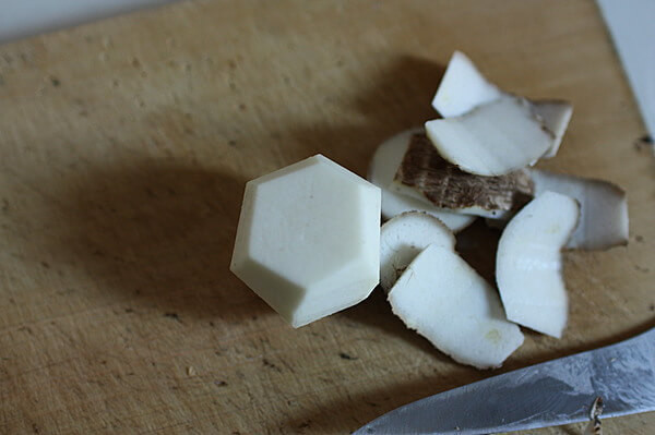 六角形になるように見当をつけて、厚めに皮を剥きます。