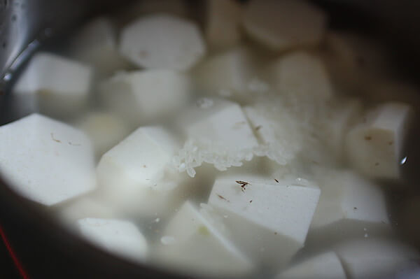 鍋に里芋とかぶるくらいの水を入れて、ひとつかみの米を入れて火にかけます。