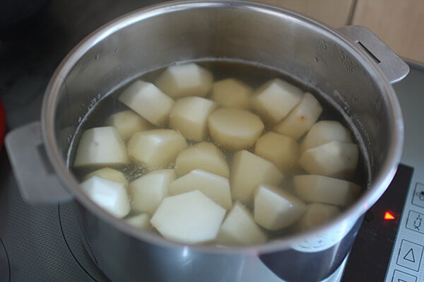 里芋を鍋に入れて、分量の出汁と調味料を入れて、再び火にかけます。