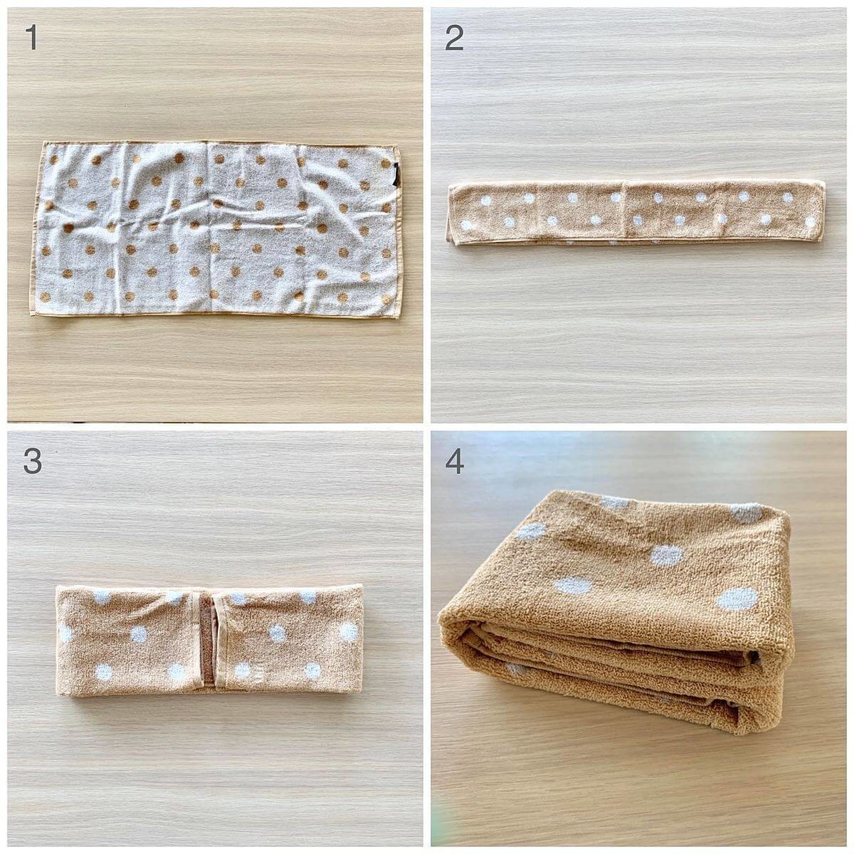 - タオルが細長くなるよう、タオルを縦に三等分に折る
