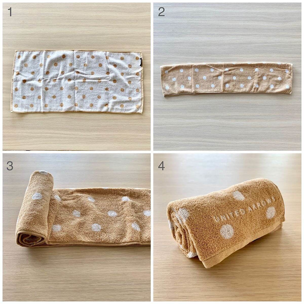 - タオルが細長くなるよう、タオルを縦に半分に折る