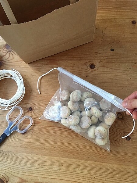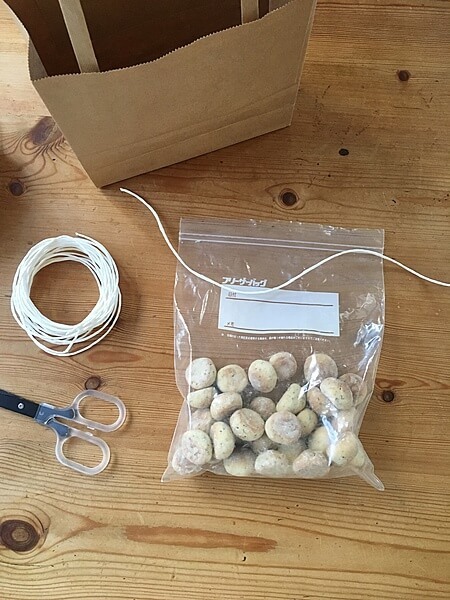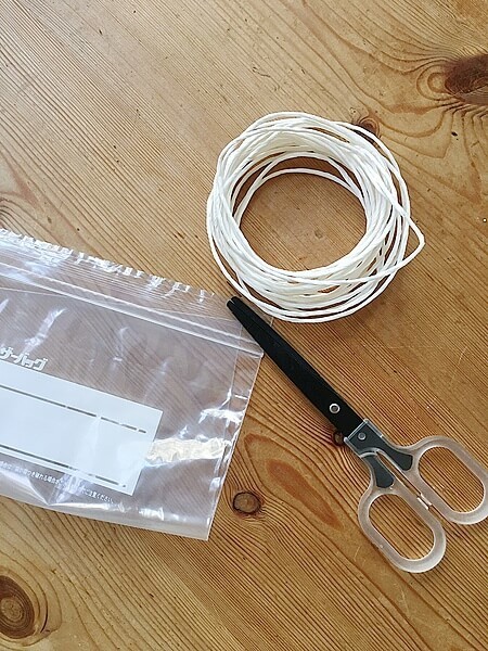 紐は紙紐ではなくても、なにか代用できるものがあれば、それを使ってもらえたらと思います。
