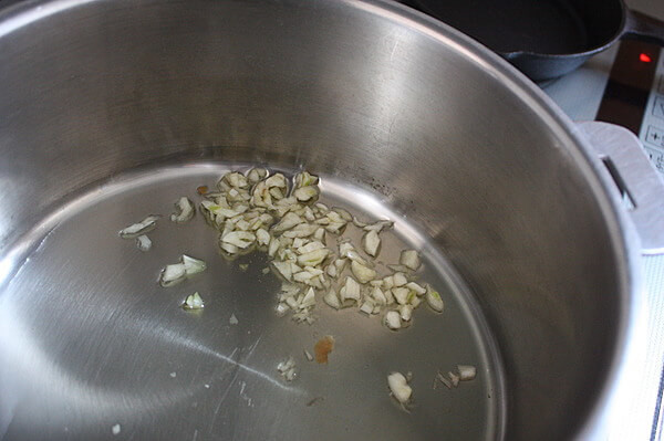 にんにくを、オリーブオイルで香りが出るまで弱火で炒めましょう。