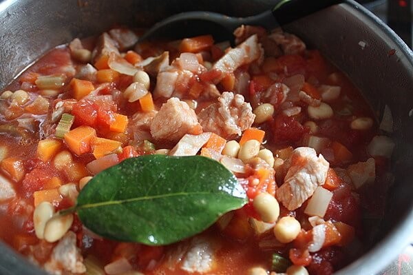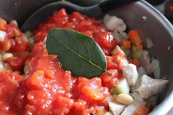 大豆、トマト水煮缶、月桂樹の葉もいれましょう。