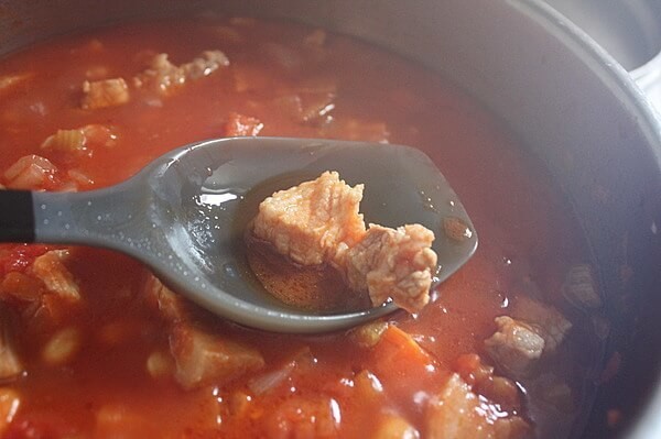 トマト缶はダイスタイプをそのまま入れましたが、ホールの場合はザクザク切ってから入れるか、手でつぶしながら入れて下さいね。