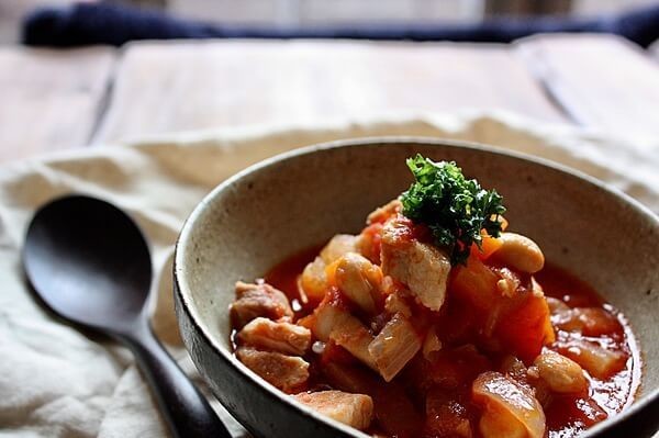 寒い季節に嬉しい、野菜の水分だけで煮た旨味たっぷりなポークビーンズ。