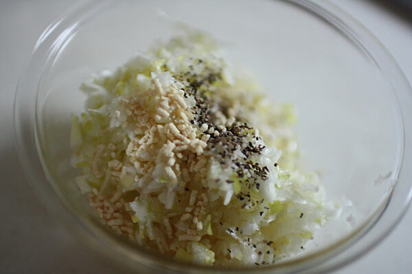 刻んだネギに、ごま油・塩・鶏ガラスープの素かうま味調味料、ブラックペッパーを加えて混ぜ混ぜ……。