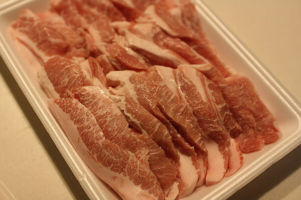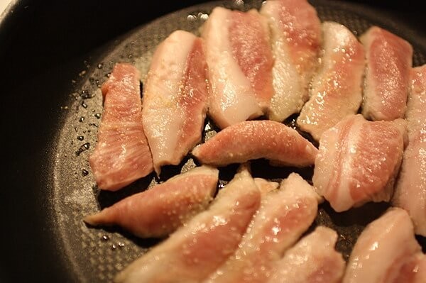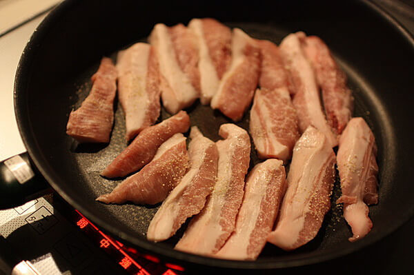 火にかける前のフライパンに、豚トロを並べてから火をつけます。