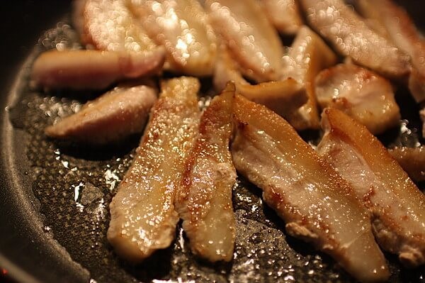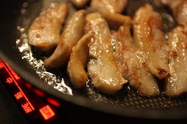 じっくり脂を出したいので、冷たいフライパンから焼きはじめますよ。