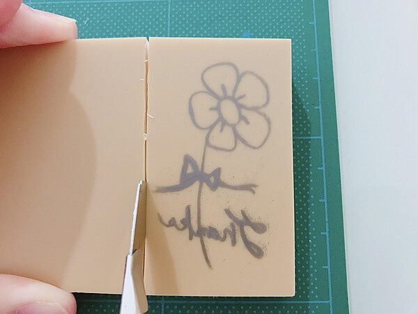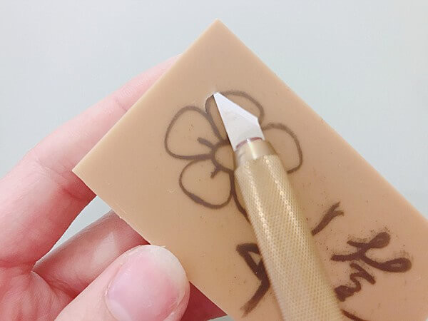 彫る前に、彫りやすいように周りの余分な部分をカッターで切り落としていきましょう。いよいよくラインを彫っていきます。