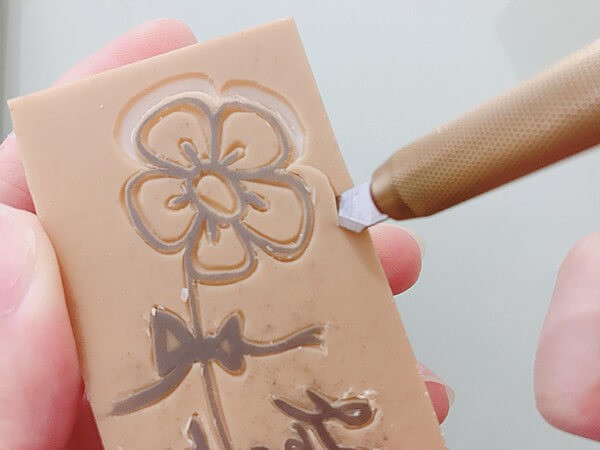 浮き出た絵柄全体の外周を絵の外側に向かって、切り込みを入れていきます。さっきまでの彫りよりも気持ち深めに彫ることがポイントです。