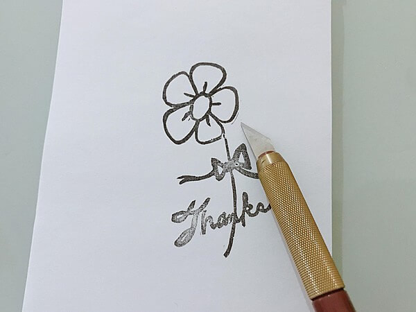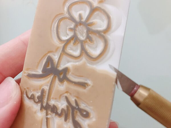 一度試しに押してみて、気になる部分を再度整えていきましょう。 線の角ばりや余分な部分を、押した絵を見ながらハンコを削っていきます。