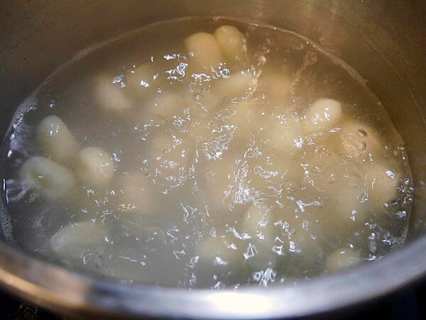 - 塩大さじ2を加えた水を大鍋で沸騰させ、ニョッキを茹でる。ニョッキは最初に沈み、茹であがったら浮いてくるので、すくい上げて別皿に入れておく