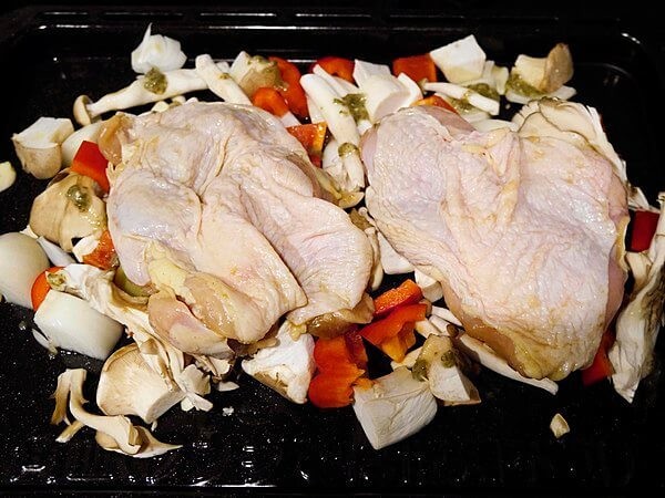 - ビニール袋に鶏と本品を入れて、しっかり揉み込んでマリネに。30分冷蔵庫の中で放置。その間に、オーブンを予熱で220度まで温める