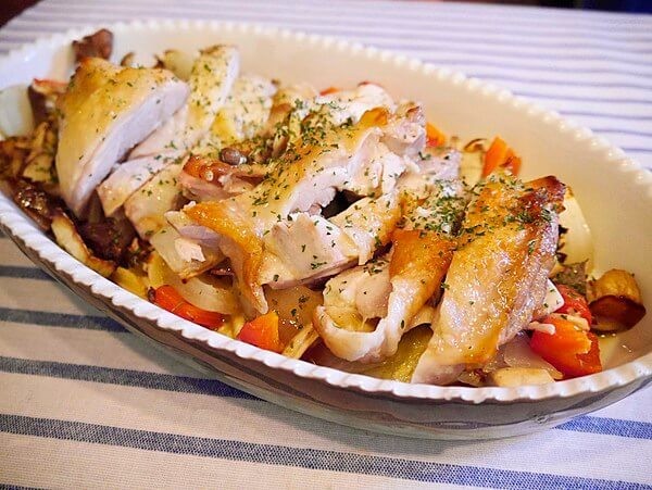 - オーブンの天板に野菜と鶏肉をのせて手早く和え、220度のオーブンで30分ほど焼いたら完成です