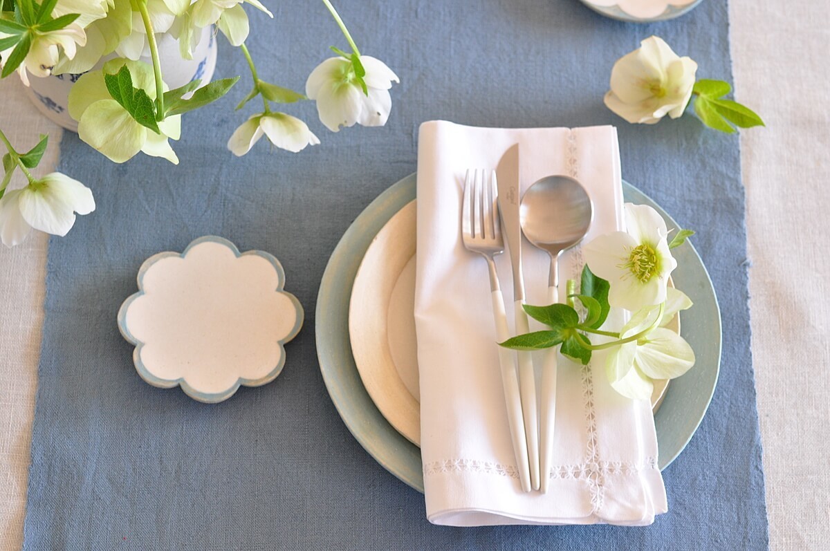 さらにはテーブル周りのお花、置物、テーブルクロスやテーブルランナーなども、食器やカトラリーに合わせて選んでいくと統一感を出すことができます。