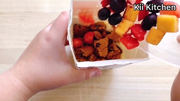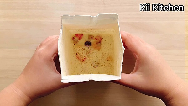 牛乳パックの口を開き、細かく砕いたチョコチップクッキーと、冷凍のミックスフルーツを入れます。