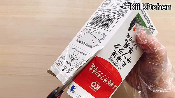 キッチンバサミで、牛乳パックを切り開いて……