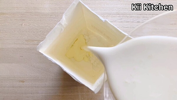 牛乳パックに、生クリームとお砂糖を入れます。