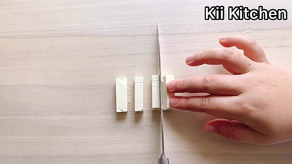 クリームチーズは、1個を4等分のスティック状に切り分けます。